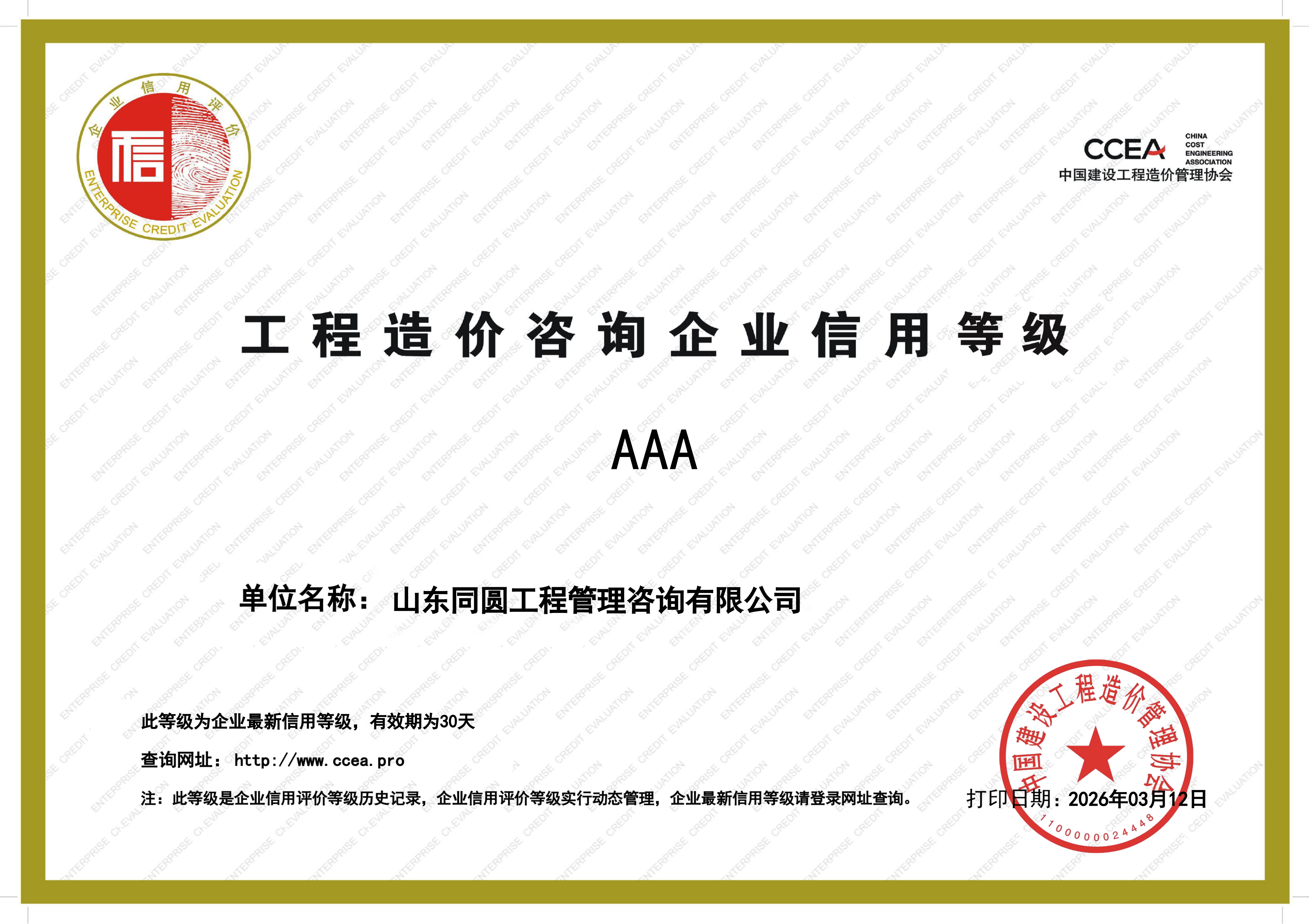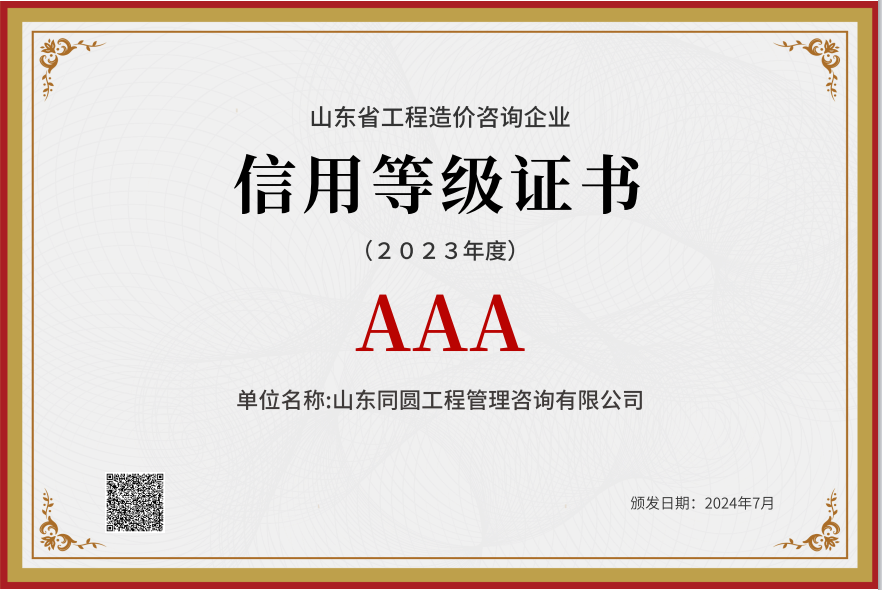 山东省工程造价咨询企业信用等级AAA级证书