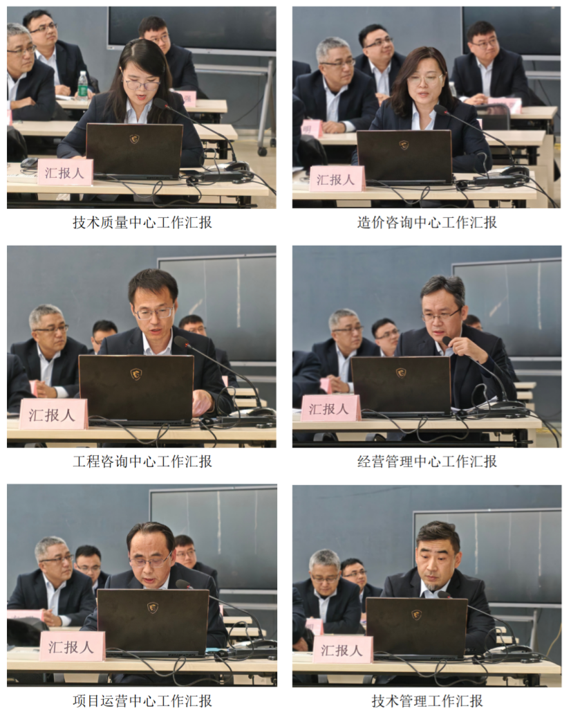 会议首先由技术质量中心、造价咨询中心、工程咨询中心、经营管理中心、项目运营中心及总工办负责人依次进行年度工作汇报。各位负责人围绕年度责任目标,从市场拓展、生产组织、团队管理等多方面系统总结了2025年的工作成果,既展示了一年来取得的亮点与突破,也坦诚剖析了当前存在的短板,并依据部门职能明确了2026年的工作计划与发展目标。